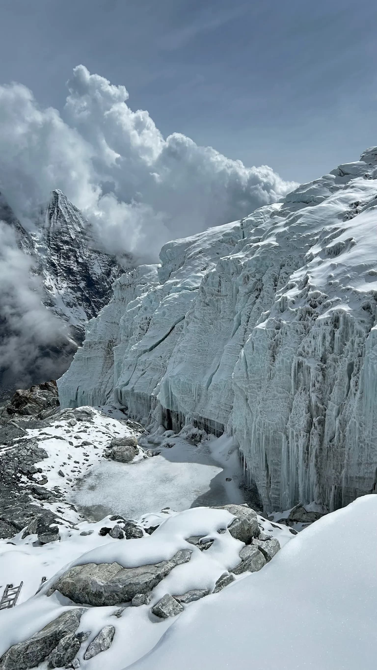 Nepal's largest glacier, stretching 12 kilometers, lies between Everest and the Nuptse-Lhotse range. It begins at Everest Base Camp and features massive icefalls.